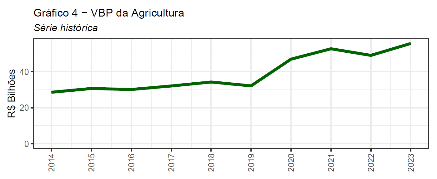 O Valor Bruto da Produção (VBP) de Mato Grosso do Sul será recorde nesse ano, conforme projeção do Ministério de Agricultura, Pecuária e Abastecimento. Os dados constam na Carta de Conjuntura da Agropecuária número 2 elaborada pela Assessoria de Economia e Estatística da Semadesc (Secretaria de Meio Ambiente, Desenvolvimento, Ciência, Tecnologia e Inovação). A soma de todas as vendas dos produtos agrícolas realizadas no Estado em 2023 deve atingir R$ 55,78 bilhões, um aumento de 13,49% em comparação com o apurado no ano passado.