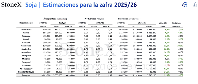 De acordo com a analista, os resultados esperados são positivos em todas as regiões produtoras. “Inclusive em San Pedro, que vinha sendo fortemente afetada nos últimos anos, a expectativa agora é de uma safra considerada normal pela primeira vez em quatro anos”, destaca. No entanto, completa, não se trata de uma “supersafra” excepcional, mas de uma campanha claramente melhor do que a prevista inicialmente.