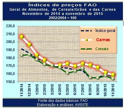 Aliás, em relação aos preços de novembro de 2014, são as carnes que apresentam o maior índice de redução: menos 23%, enquanto os cereais registram recuo de 16% e o índice geral FAO de 18%.
