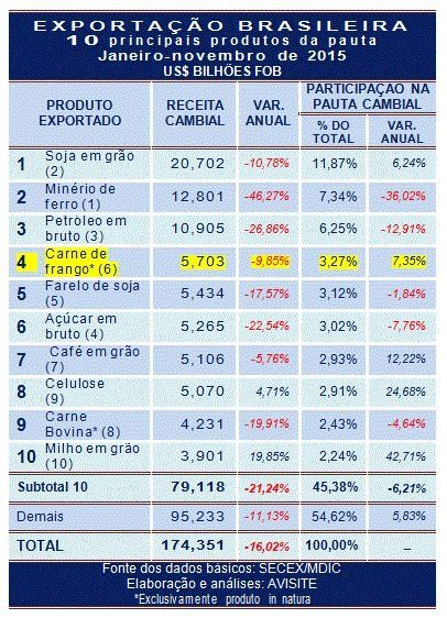 Nesse quesito, a carne de frango apresenta comportamento oposto. Sexto item da pauta no ano passado (ou 5º, se o farelo de soja for agregado ao grão), a carne de frango teve sua participação neste ano aumentada em mais de 7% e responde agora por 3,27% da receita exportadora brasileira (isto, considerado apenas o produto in natura). E, com esse índice, se coloca como o quarto item da pauta.