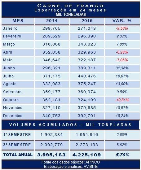 Em junho de 2015 o acumulado em 12 meses chegou aos 4,045 milhões e, nos seis meses seguintes, só não aumentou em outubro porque os embarques foram prejudicados por uma combinação de movimentos trabalhistas internos e paralisação de portos devido às chuvas. Com isso, a expansão do primeiro semestre, limitada a 2,6%, subiu no segundo semestre para 8,6%, garantindo incremento anual de 5,76%