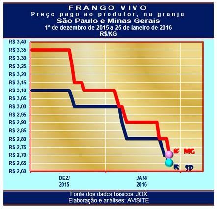 Nas duas praças, o preço recebido pelo produtor retrocede aos níveis registrados em meados de julho de 2015, ocasião em que o frango vivo entrava em um processo de recuperação de preços que viria a culminar, quatro meses depois, na obtenção das melhores cotações nominais já obtidos pelo produto – panorama que se manteve até, aproximadamente, dez dias antes do Natal. Desde então, as quedas têm sido quase contínuas, com rápidos períodos de estabilização.