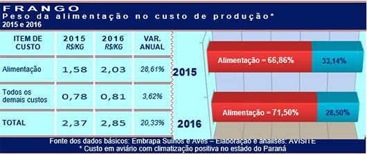 Já era sabido, mas os números confirmam que a maior parte desse aumento foi devido ao custo da alimentação. Ou seja: excetuada a alimentação, todos os demais custos envolvidos na produção do frango aumentaram apenas 3,62% - abaixo, portanto, da inflação (6,29% pelo IPCA do IBGE).